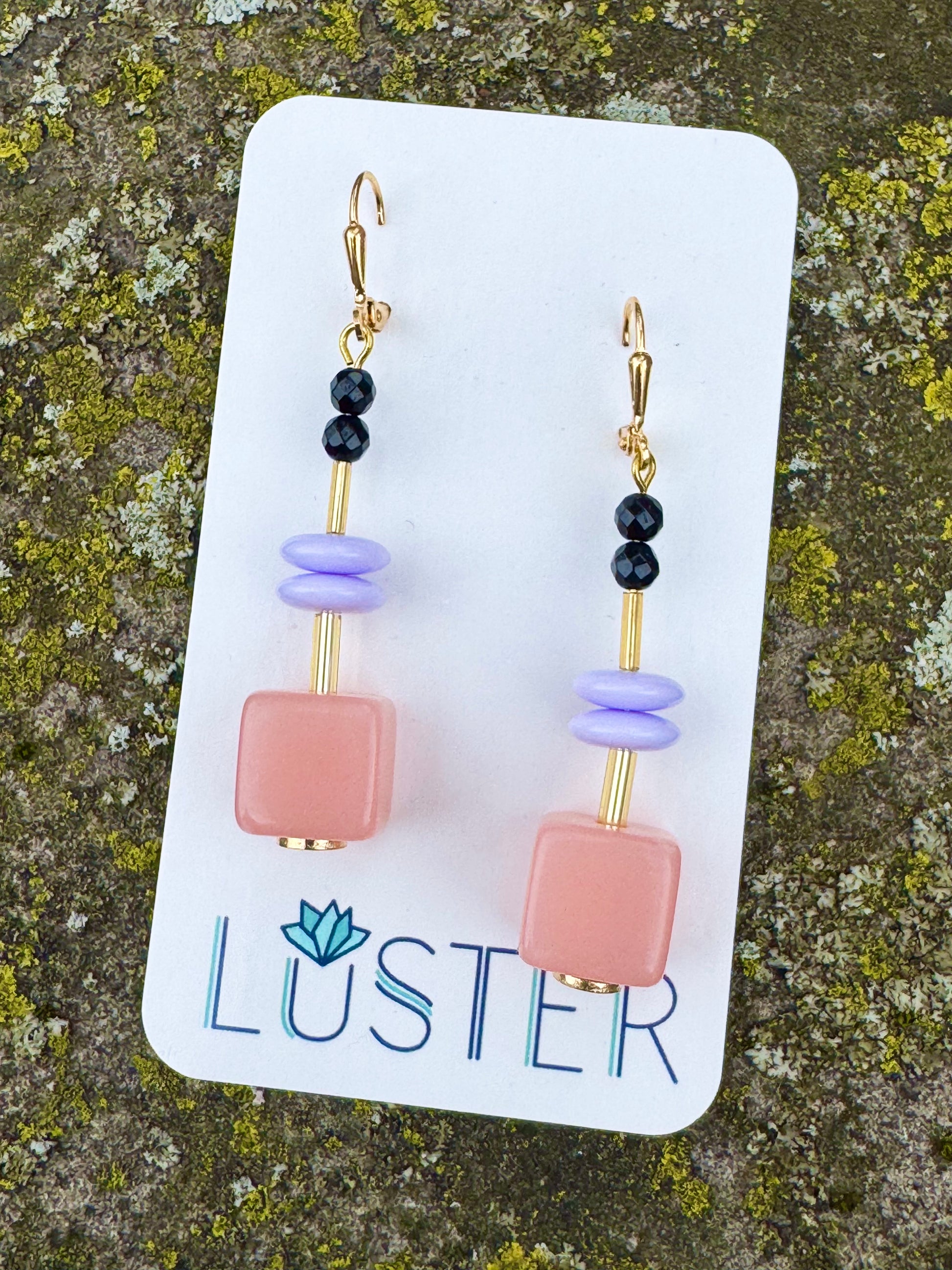 Fun pink cubes with lilac spacers and black faceted accent beads.